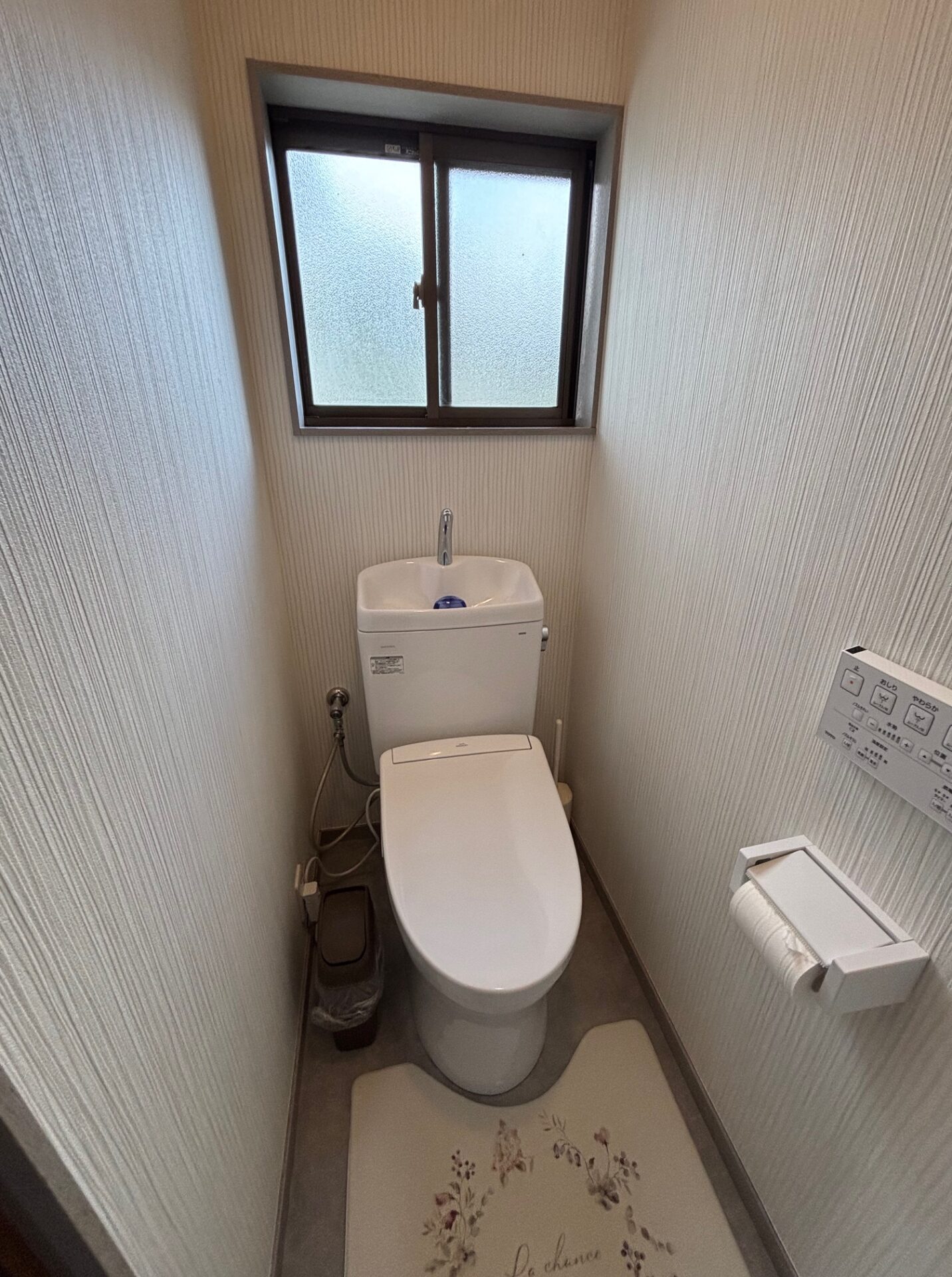 壁紙も含め内装をすべて一新したいとご希望でしたので、TOTO ピュアレストQR+SS2(手洗付き)と併せて内装のフルパック+紙巻器+タオル掛けのリフォームをご提案しました。